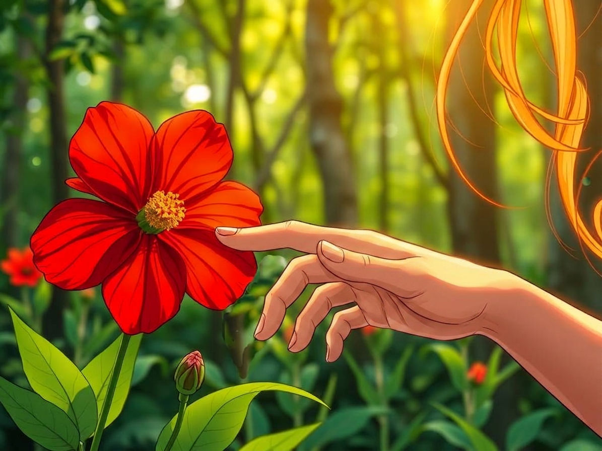 She inhaled the sweet, summery scent of the pine, and ran her hands over the moss and leafy overgrowth scattered all around her. She stopped in front of a bright red flower and admired it. Funny, she thought. I thought I knew every flower and shrub down this path. Iโve never seen this one before.