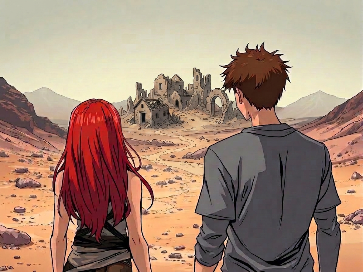 A flash of light was all that was seen in the dry wasteland of Khotar. Presently, two figures stepped through, the dust and wind playing friskily with their hair.