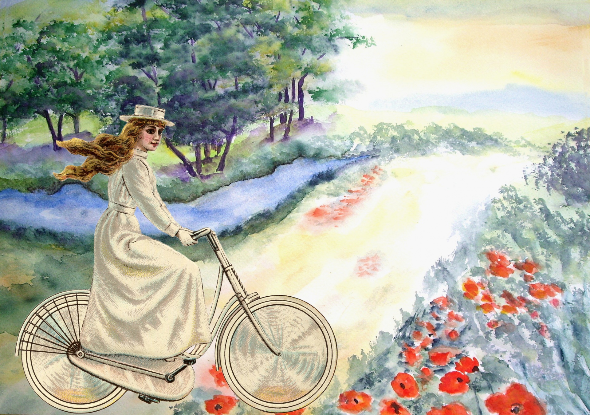 Photo: Digital collage of vintage lady cycling through poppy fields. Public Domain.