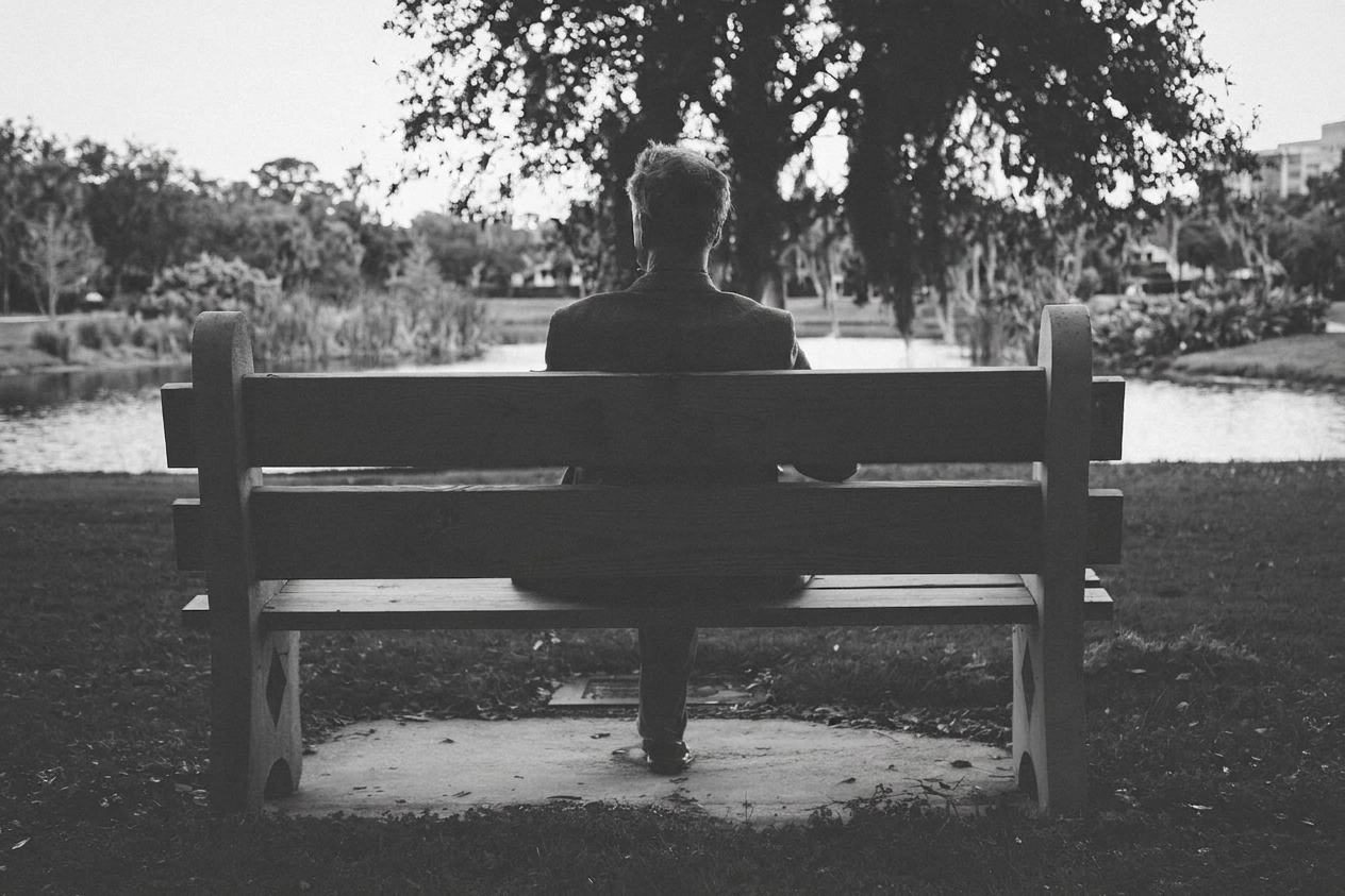 The Gentleman was sitting on an old, plastic bench under the tree. He wore a black suit, with a black dress shirt, shoes, tie, and had hair to match the solemn outfit. He was sitting straight, his dark eyes cast out over the pond.