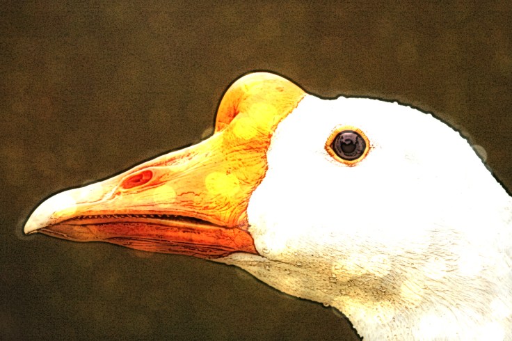 The goose honked his sympathy. Sensing that the little girl was distracted, he climbed into her lap and nuzzled her chin. She absently stroked the goose’s head and beak.