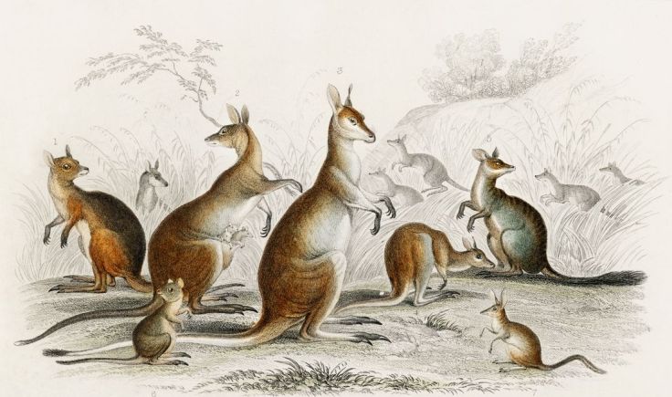 Image: Lord Derby Kangaroo, Aroe Kangaroo, Parry’s Kangaroo, Woolly Kangaroo, Brush Tailed Kangaroo, Rat-Tailed Hypsiprymnus, and Rabbit-Eared Perameles. Digitally enhanced from our own original edition of A History of the Earth and Animated Nature (1820) by Oliver Goldsmith (1730-1774). Public domain.