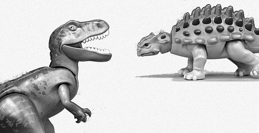 An unseen clock strikes twelve times. It is noon, and TILA REX and AHNKIT SAURUS are now almost right in front of each other.